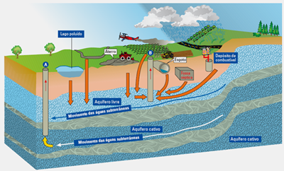 Características dos aquíferos cativos Toda a espessura do aquífero está saturada de água e a pressão no seu interior é superior à pressão atmosférica. A recarga destes efectua-se lateralmente. Gestão das Águas Subterrâneas A água é um recurso renovável, mas com o aumento demográfico , as necessidades de água aumentaram. O que levou, consequentemente ao aumento da poluição da mesma. As principais formas de poluição são, a poluição agrícola, industrial e urbana. Poluição de origem agrícola Utilização de adubos e pesticidas, que possuem substâncias nocivas para os aquíferos. Lançamento de resíduos animais como fertilizantes que acabam por contaminar os aquíferos.