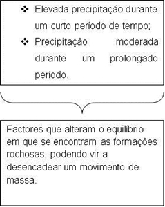 Figura 3 – Movimentos de massa ao longo de uma vertente Factores que influenciam a existência de movimentos de massa: Factores condicionantes: Os movimentos do terreno são, antes de qualquer factor, fortemente condicionados pela força da gravidade. Sendo assim, o contexto geológico e as características geomorfológicas de um determinado local, condicionam a ocorrência de qualquer movimento de massa. Contexto Geológico: 1) Tipo e características das rochas constituintes da zona: Rochas que apresentem uma menor resistência a fracturas (ex. rochas com foliação) tendem a quebrar-se (quando sujeitas a uma força de determinada intensidade) e a originar um movimento de massa; A existência de fracturas e poros nas rochas vai facilitar a acção dos agentes de meteorização e erosão; A presença da água em certos constituintes rochosos da vertente (por exemplo, as argilas) pode provocar a diminuição da coesão entre estes (meteorização química: dissolução/hidratação), contribuindo para a sua erosão. 2) Orientação e inclinação das camadas constituintes da zona: Quanto maior o grau de inclinação da vertente mais se vai fazer sentir a acção da força gravítica, que é aplicada a todas as partículas independentemente da sua distância ao solo. 3) Presença/ausência de vegetação: A cobertura vegetal além de funcionar como um elemento de agregação do solo desempenha um papel protector, defendendo a zona de vertente contra a erosão, diminuindo os seus efeitos sobre as vertentes. Na ausência desta cobertura a zona de vertente encontra-se mais sujeita à acção da meteorização e da erosão facilitando a ocorrência de movimentos de massa. Estes factores vão atrasar ou retardar a ocorrência de um movimento em massa. Características geomorfológicas: O declive do terreno, em conjunto com a gravidade, revela-se como o principal factor que influencia o deslocamento de massas.