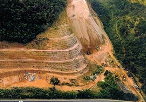 Fig.11: Destruição do coberto vegetal Os deslocamentos de massas podem ainda ocorrer, com uma certa facilidade, em locais onde existam falhas. Quando sujeitas a dobras, as massas rochosas encontram-se sob a acção duma meteorização e erosão que acabam por ter um maior efeito devido às falhas, além de o declive da zona ser alterado.