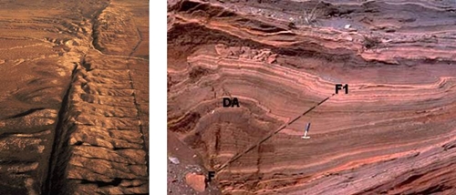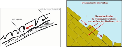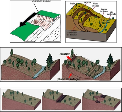 Fig.16: Exemplos de deslizamentos rotacionais Deslizamento Translacional com rotura planar São típicos de meios anisótropos (meios fisicamente homogéneos, mas cujo propriedades físicas e químicas variam com a direcção) e apresentam, frequentemente, um controlo estrutural evidente: o plano de rotura desenvolve-se ao longo de superfícies de fraqueza, marcadas por uma resistência ao corte reduzida, como falhas, planos de estratificação, diaclases ou contacto entre uma cobertura detrítica e um substrato rochoso