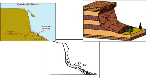 Fig.14: Quedas de Blocos O Balanceamento consiste na rotação de uma massa de solo ou rocha, a partir de um ponto ou eixo situado abaixo do centro de gravidade de massa afectada, devido essencialmente à influência da gravidade e à acção de orcas laterais. Este movimento é comum em massas rochosas com descontinuidades inclinadas de modo contrário ao declive, desenvolvendo-se lentamente e pode ou não evoluir para desabamento ou deslizamento, em função da geometria da massa afectada e da extensão e orientação dos planos de estratificação e/ou diacláses.