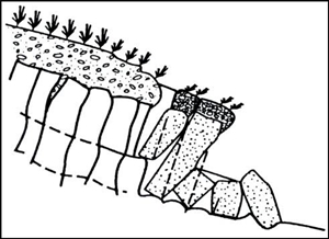 Fig.18: Superfícies de fraqueza deste Expansão lateral A expansão lateral em solos é um mecanismo extremamente rápido, responsável por situações de perigo declarado. O movimento é definido como o colapso de uma camada de solo a uma certa profundidade, seguido do assentamento das camadas sobrejacentes mais resistentes ou da rotura progressiva de toda a massa afectada. As causas desencadeantes destes mecanismos resultam da combinação da concentração de água em solos, devido a longos períodos de chuva, gelo ou toalhas freáticas a pouca profundidade, e sismos que provocam a liquefacção de massas sensíveis a este fenómeno.