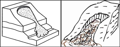 Fig.19: Expansão Lateral Escoadas A escoada (flow) é um movimento espacialmente contínuo onde as superfícies de tensão tangencial são passageiras e frequentemente não preservadas, estando, em regra geral, associadas a períodos de precipitação muito intensa. A distribuição das velocidades na massa deslocada assemelha-se à de um fluido viscoso e a velocidade depende do declive da vertente, ausência ou presença de obstáculos, da viscosidade da massa, da forma do leito de escoamento e do volume da massa em movimento. Condicionadas pela topografia, são caracterizadas por apresentarem três grandes unidades morfológicas, um sector de rotura em que se forma uma cicatriz, um sector de transporte por onde se movimentam os materiais oriundos do talude e uma área de acumulação junto à base da vertente, tal como um leque aluvial característico da dinâmica de deposição de um rio.
