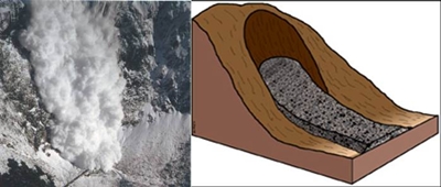 Fig.20: Escoadas Avalanches As avalanches resultam do completo colapso de uma vertente íngreme, em consequência do que se verifica movimentação, com velocidade muito elevada, de grandes volumes de misturas de rocha. Na realidade, este tipo de movimentações de massa é complexo, isto é, resulta da combinação de vários tipos de movimentação (queda de rochas, deslizamento, fluxos vários). Em princípio, quanto maior é a avalanche detrítica maior é a velocidade a que ela se desloca, pois maior é a energia associada ao material em movimento. Este tipo de zonas de vertente é frequentemente induzida por sismos ou erupções vulcânicas. Neste contexto, convém distinguir entre avalanches "quentes" e avalanches "frias". No que diz respeito ás erupções quentes, estas resultam de actividade vulcânica sendo induzidas por sismos associados ao vulcanismo ou explosões vulcânicas, enquanto as avalanches frias ocorrem em regiões não vulcânicas.