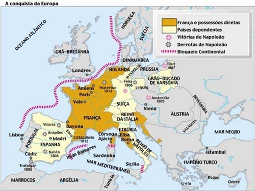 Ideias da Revolução: . Fim do absolutismo do rei. . Liberdade de escolher as leis. . Lei de igualdade para todos os grupos sociais. O Bloqueio Continental Napoleão Bonaparte, comandante das tropas francesas, conseguiu dominar uma grande parte da Europa. Porem, a Inglaterra demonstrou ser um inimigo muito difícil de vencer, e em 21 de Novembro 1806, Napoleão ordenou aos outros países da Europa que fechassem os seus portos aos navios ingleses. A essa ordem chamou-se Bloqueio continental. Mas, no entanto, Portugal ainda mantinha relações comerciais com Inglaterra e não aderiu ao Bloqueio. Em resposta a esta atitude portuguesa, Napoleão ordenou a invasão de Portugal.