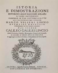 Fig.10 - Sidereus Nuncius Istoria e dimostrazione intorno alle macchie solari (fig.11) - Num texto publicado em 1613, Istoria e dimostrazione intorno alle macchie solari (História e demonstração sobre as manchas solares) Galileu fez um elogio do sistema coperniciano em três linhas no final da obra. No entanto foi o suficiente para enfurecer os académicos aristotélicos.