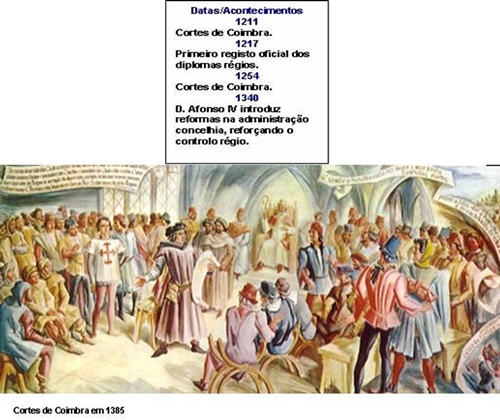 Factor estruturante de coesão interna do reinoIntrodução Neste trabalho vamos falar do poder que o rei tinha no inicio da monarquia e como se foi modificando o seu poder ao longo das décadas, como foi governado o nosso país e as alterações a que foi submetido na idade média. Funções do monarca no inicio da monarquia No inicio da monarquia o rei tinha sobretudo uma função guerreira. A luta contra os Muçulmanos permitiu-lhes afirmar a sua supremacia a nível interno, perante os seus súbditos e a nível externo frente ao Papa. O monarca para além da função guerreiro a sua outra função era de dividir as presúrias pelos concelhos e senhorios atribuindo cartas de foral, cartas de honra e cartas de couto. Não lhe cabia a ele julgar, pois atribuía esses poderes para se poder dedicar á guerra. D. Afonso II - Novo conceito de Poder real e a centralização do poder No reinado de D. Afonso II uma nova ideia de poder real começou-se a formar. Juristas e letristas queriam afirmar o poder real acima de todos os poderes do país. Uma assembleia em Coimbra em que participaram membros do clero e nobreza, iniciava um processo de centralização do poder régio. O rei afirmava publicamente a supremacia do seu poder e promulgava as primeiras leis do reino. Ao promulgar estas leis o rei afirmava a sua superioridade no poder legislativo, determinou-se que no reino apenas se guardavam as leis do rei e as da Igreja Romana. Em termos judiciais, o rei afirmou a sua superioridade ao afirmar que todos poderiam ser julgados pelo rei, e criou uma rede de juízes submetidos ao rei que cobria todo o reino. Mais tarde D. Dinis continuando com este processo de centralização, obrigou os concelhos a formar e equipar um determinado número de besteiros para ajudarem na defesa do reino, afirmando-se assim o rei na área da defesa. O Reforço dos poderes da chancelaria No desempenho das suas atribuições, o Rei era auxiliado por um grupo de altos funcionários com funções bem determinadas: o alferes-mor, a quem competia a chefia do exército na ausência do monarca; o mordomo da corte, responsável pela administração da casa real; o chanceler, guarda do selo real utilizado na autenticação dos documentos. Terminada a Reconquista e numa altura em que a Realeza deu especial atenção à produção legislativa, foi o chanceler a ocupar o primeiro lugar na hierarquia dos altos funcionários do Estado. Organizou-se, a partir de então, a chancelaria régia, à frente da qual se encontrava o chanceler, auxiliado por escrivães, encarregados da redacção dos diplomas, e por notários, a quem competia submeter os documentos para efeitos de validação. A reorganização administrativa a nível central e local A crescente complexidade das tarefas administrativas e financeiras obrigou a Coroa a criar novos funcionários, homens especializados em determinadas tarefas, como o porteiro-mor, que superintendia à cobrança dos impostos, e o tesoureiro-mor, que tinha o encargo de guardar o dinheiro nos cofres reais. A administração central integrava ainda um grupo restrito de conselheiros – a Cúria ou Conselho. A partir do século XIII, a Cúria deu origem a dois órgãos distintos: O conselho régio, composto por prelados, ricos-homens e militares que frequentavam a corte. A institucionalização das Cortes As Cortes eram assembleias que o rei convocava para ouvir o parecer dos membros do clero e da nobreza – a partir de 1254 (Cortes de Leiria), passaram a participar também os procuradores dos concelhos – em matérias importantes para a governação, como o lançamento de impostos, a modificação do valor da moeda e a promulgação de leis. A reunião das Cortes era também uma oportunidade para os representantes das várias ordens apresentarem as suas petições ou queixas e sugerirem medidas de resolução para situações anormais. As cortes mais antigas de que há notícia realizaram-se em Coimbra, em 1211, no reinado de D. Afonso II. A sua importância deriva do facto de terem sido aí aprovadas as primeiras leis gerais que se conhecem em Portugal. Em 1254, as Cortes de Leiria contaram já com a activa participação dos representantes dos concelhos, facto que revela o reconhecimento real do papel do terceiro Estado na administração do Reino.