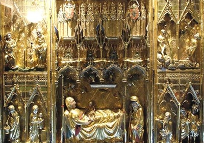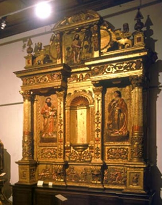 A sua criação e o seu desenvolvimento O Museu de Alberto Sampaio situa-se em pleno centro histórico, no local onde a condessa Mumadona, no século X, mandou construir um mosteiro. Sendo inicialmente um mosteiro dúplice, nos alvores do séc. XII, transformou-se em Colegiada, tendo então sofrido obras de renovação.  Ilustração 1 - Museu Alberto Sampaio Fonte: Google É um museu estatal, dependente do Instituto Português de Museus. Foi criado em 1928, para albergar o espólio de extintas instituições religiosas locais então na posse do Estado, tendo sido aberto ao público em 1931, está instalado em edifícios de valor histórico e artístico que pertenceram à Colegiada de Nossa Senhora da Oliveira, e que se desenvolvem em torno de um claustro. O programa museográfico actual data, no essencial, dos anos 60. Estão expostas valiosas colecções de arte antiga, em que avulta o legado dos séculos XIV, XV, e XVI, e cuja peça de maior significado histórico é o loudel do rei D. João I (séc. XIV). Um dos traços mais característicos do Museu é a harmonia entre as peças e os espaços em que são apresentadas. A escolha de Alberto Sampaio como patrono do Museu constituiu uma homenagem aquele historiador vimaranense, que se dedicou sobretudo à história regional (1841 - 1908).O conjunto de relíquias do Museu de Alberto Sampaio é diversificado, mas coerente na sua diversidade e homogéneo na qualidade. É constituído pelas seguintes colecções: ourivesaria, pintura, escultura, talha, têxteis, cerâmica e azulejaria. Colecções – Ourivesaria  Ilustração 2 - Tríptico de Prata Dourada Fonte: Google A ourivesaria é a mais importante coleção do Museu, integrando o tesouro da Igreja da Colegiada de Nossa Senhora da Oliveira. Entre as alfaias litúrgicas expostas encontram-se cálices, patenas, custódias, cruzes e relicários. São peças de tipologia e função variadas permitindo acompanhar a evolução do gosto desde o século XII até ao séc. XIX. De entre as peças da coleção que merecem destaque, refira-se o Tríptico de Prata Dourada oferecido a Colegiada por D. João I.  Ilustração 3 - Relicário Fonte: Google  Ilustração 4 - Cofre Relicário Fonte: Google Colecções – Têxtil A coleção têxtil, composta por diversas vestes litúrgicas e por um significativo núcleo de amostras de tecido, é essencialmente conhecida e referida pela existência no seu percurso expositivo da veste militar trecentista, o loudel, que D. João I envergou durante a batalha de Aljubarrota e que, posteriormente, ofertou a Santa Maria de Guimarães, em agradecimento por ter vencido a dita batalha.  Ilustração 5 - Loudel de D. João I Fonte: Google O loudel de D. João I pode ser descrito como uma veste com forma de colete cintado que se estende até aos joelhos, composta por várias camadas de linho e enchimento de lã, acolchoadas. Aperta-se na parte frontal através de vários botões pouco intervalados e na parte inferior termina com recortes em bico. Apesar do desgaste que a peça apresenta, são percetíveis vestígios do brasão de armas de D. João I na parte inferior direita. Quadrado de tecido egípcio do séc. IV dC, medindo 23 cm por 23 cm. É em linho bordado a fio de lã castanha com motivos geométricos, motivos de animais e figuras humanas, remanescência a um mosaico.  Ilustração 6 - Tecido Egípcio Fonte: Google Colecções – Cerâmica A cerâmica, predominantemente de origem portuguesa, merece especial atenção. Há exemplares seiscentistas a azul, branco e vinoso, bem como peças provenientes das fábricas de Viana do Castelo, Porto, Gaia e Lisboa.  Ilustração 7 - Galheteiro Fonte: Google Galheteiro do séc. XVIII composto por um suporte e quatro peças: dois pequenos potes com tampa e dois pequenos jarros de bico também com tampa com destino para o azeite e para o vinagre. Todo ele é decorado com motivos florais. Peça de louça representando uma mulher jovem em pé de cabeça ligeiramente inclinada para o lado direito. Usa um vestido comprido e um lenço que passa por cima do ombro esquerdo e por baixo do braço direito e que se amarra à frente na zona da cintura, cobrindo as duas mãos pousadas sobre a cinta e a barriga. Esta peça tem a função de garrafa.  Ilustração 8 - Peça de louça Fonte: Google  Ilustração 9 - Azulejo séc. XVIII Fonte: Google Colecções – Pintura A pintura está bem representada por um conjunto de seis frescos destacados, provenientes de igrejas do Norte de Portugal. De entre os quais se destaca “A Degolação de S. João Batista”, proveniente da Sala do Capítulo da Venerável Ordem Terceira de S. Francisco. Também por várias pinturas sobre tábua – o Tríptico da Lamentação, a Virgem do Leite entre S. Bento e S. Jerónimo, a Virgem com o Menino e o Pentecostes, este último proveniente da Capela do Senado, de Guimarães. “A Degolação de S. João Batista” é um fresco que representa o episódio da degolação de S. João Batista. Como pano de fundo, à esquerda, vê-se uma casa com torre. Há duas cenas em primeiro plano: uma interior e outra exterior.  Ilustração 10 - Fresco “A degolação de S. João Batista” Fonte: Google Do lado direito, sentado a uma mesa com alguns alimentos (um cálice, um prato com um frango e pão) está Herodes de barbas compridas, com as mãos levantadas e os olhos fechados. À sua esquerda encontra-se Herodíade, a cunhada, com a cabeça inclinada para o lado direito agarrando a cabeça de S. João Batista pelos cabelos na mão esquerda e exibindo uma expressão de satisfação, também evidenciada pelo gesto da sua mão direita com dois dedos levantados em sinal de vitória. Em pé e à sua frente, Salomé apresenta-lhe a bandeja com a cabeça do santo. Do lado esquerdo do quadro, está o santo ainda ajoelhado e com as mãos em sinal de oração mas já sem cabeça. Aparece ladeado por dois soldados, um dos quais se encontra ainda de espada em riste. Cole
