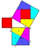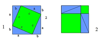 (As medidas expostas no quadrado1 são as mesmas para o quadrado2) Os triângulos azuis são geometricamente iguais. Os quadrados 1 e 2 são geometricamente iguais. Se os triângulos são geometricamente iguais, o quadrado a verde da figura 1 tem a mesma área que os quadrados da figura 2, logo: A2+A1óa2 + b2 + 4T= c2 +4tóa2+b2=c2 Para melhor entender as diferentes maneiras de demonstrar o teorema de Pitágoras, expomos, seguidamente, outro exemplo.
