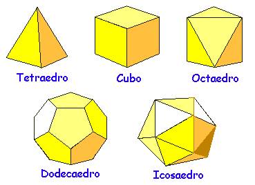 . Tetraedro (4 vértices, 6 arestas, 4 faces (triângulos equiláteros) . Cubo ou hexaedro (8 vértices, 12 arestas, 6 faces (quadrados) . Octaedro (6 vértices, 12 arestas, 8 faces (triângulos equiláteros) . Dodecaedro (20 vértices, 30 arestas, 12 faces (pentágonos) . Icosaedro (12 vértices, 30 arestas, 20 faces (triângulos equiláteros).