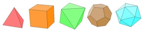 Enumeremos então os sólidos que acabámos de construir: tetraedro, octaedro, icosaedro, cubo e dodecaedro. São precisamente cinco, como se queria demonstrar. Outra forma demonstrar a existência de apenas cinco sólidos platónicos é através da fórmula de Euler, considerando as restrições relativas aos vértices, arestas e faces inerentes aos sólidos platónicos. Um pouco de História: Grandes filósofos e matemáticos dedicaram a vida ao estudo da geometria. Enquanto a escola pitagórica, por exemplo, tinha como lema "Tudo são números" a escola de Platão (a Academia) tinha escrito sobre a porta, "Não entre aqui ninguém que não seja geométra". Platão foi o primeiro matemático a demonstrar que existem apenas cinco poliedros regulares: o cubo, o tetraedro o octaedro, o dodecaedro e o icosaedro. A eles se referiu no seu dialogo "Timeu" pelo que esses cinco poliedros regulares passaram a ser designados por sólidos platónicos. O conhecimento destes sólidos parece ter sido desencadeado num encontro com Arquitas que, em viagem à Cecília, no sul de Itália, encontraria Platão. Para este, o Universo era formado por um corpo e uma alma, ou inteligência. Na matéria havia porções limitadas por triângulos ou quadrados, formando-se elementos que diferiam entre si pela natureza da forma das suas superfícies periféricas. I. Se fossem quadradas, teríamos