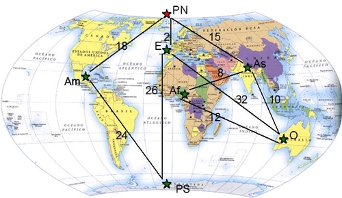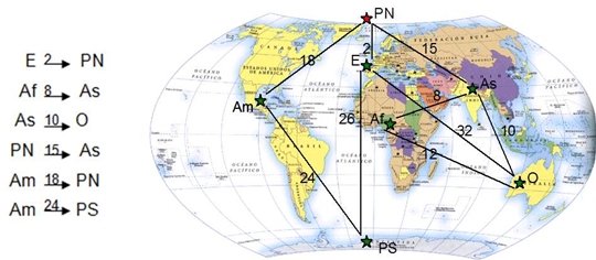 R: O percurso mais rápido para a rena é o apresentado em ambas as soluções, que corresponde a 220 metros. Redes As árvores abrangentes mínimas servem de solução a muitos problemas que englobamos num só tipo, as redes. Aplicadas nas mais diversas situações, desde a construção duma rede de cabos à ligação de cidades por estradas, com o apoio do Algoritmo de Kruskal. Exemplo: O Pai Natal, sensibilizado pelos problemas ecológicos e suas consequências, achou que fazer a separação do lixo não era suficiente para ajudar o ambiente. Olhou para o seu escritório, e ao ver-se deparado com pilhas e pilhas de cartas das crianças, percebeu a quantidade de papel desperdiçado ali estava! Ora bem, é preciso agir. Adeus papel, e assim decidiu que modernizar-se um pouco e optar pela Internet como via de receber os pedidos simplificaria muito mais o problema. Cada país já tinha a sua ligação de cabos de Internet por todas as cidades, e havia um computador por cada zona a que ligavam todas as nações mais próximas. Era ainda necessária criar uma ligação entre essas áreas e o computador do Pai Natal, na Lapónia (Pólo Norte). No mapa estão assinalados os computadores, e os custos em Nataizz duma ligação Internet entre eles. Am – América E – Europa As – Ásia Af – África O – Oceânia PS – Pólo Sul PN – Pólo Norte