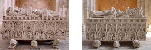 A situação antes da morte de InêsOs filhos bastardos de D.Pedro, eram aos olhos do seu avô uma maneira do país não ter paz. Depois com o aparecimento da “peste” que apavorou toda a gente, diziam os mais medrosos que era tudo “mau alhado” causado por D.Inês. O reino começa a regredir e a empobrecer, tomando o medo posse das populações, obrigando D.Afonso a arranjar uma solução para a crise publicando as “Leis do Trabalho”, que apesar de cumpridas não minimizarama situação. A população apavorada com a peste foge, sem destino exacto, abandonando assim os campos que haviam sido férteis. Deste modo, D.Pedro decide partir com D.Inês para os arredores do Porto (Canidelo) onde a instala com todas as honra e comodidades. Entretanto o descontentamento aumenta à medida que o amor entre eles aumenta também, visto que os conselheiros (Pedro Coelho, Álvaro Gonçalves e Diogo Lopes Pacheco) falavam que D.Pedro estava dominado pelos irmãos da sua amada, que eram ambiciosos e intriguistas e a quem cada vez mais oferecia doações e nomeações para além da amizade, alastrando e piorando cada vez mais o ódio á familia Castro. Os notáveis do reino temiam cada vez mais que com esta aproximanção à familia Castro, o rei passasse a ser um mau rei e receavam também a vida do pequeno Infante, filho de D.Constança. Desta maneira, Nos primeiros dias de Janeiro de 1355 planeiam a morte de Inês de Castro, no Castelo de Montemor-o-Velho, pedindo posteriormente a aprovação do rei. Puseram o rei numa situação dificil, obrigando-o a escolher entre as razoões do Estado e as do sentimento familiar. Ao escolher as razões do Estado estavaa proteger toda a população duma situação delicada no futuro e portanto a defender o seu país; por outro lado estaria a matar a mulher davida do seu filho, por si só a matar a felicidade do mesmo, a deixar os seus netos orfãos de mãe e quem sabe talvez a arranjar um problema com Castela, país da futura “assassinada”. A morte de InêsNo dia 7 de Janeiro de 1355, D.Afonso põe-se a caminho acompanhado de gente armada, para matar a adúltera. Antes da partida de D.Pedro para a caça, um estranho acontecimento se deu. Quando o infante acompanhado dos seus homens se preparava para sair, um velho cão separa-se da matilha e enfurecido corre na direcção de Inês, com um brilho demoníaco nos olhos, a boca a espumar e os dentes com um brilho especial e pronto para atacar. Foi ai que depois de petrificado, o príncipe avançou e degolou a fera caiu aos pés da sua amada, salpicando-lhe o vestido de sangue e deixando-a com uma grande angústia fazendo-a tremer ao menor barulho. Depois deste episódio estranho, o infante e os acompanhantes deixaram a sua casa e foram para a sua caçada (que normanlmente demorava um, dois ou três meses). Ai o rei aproveitou a ausência do seu filho, para entrar no paço. Inês com os seus filhos agarrados a si a berrar, suplicando ao seu sogro que tivesse piedade e misericórdia, que como rei deveria ponderar melhor as suas decisões e chegou mesmo a pedir perdão, mas, apesar das tentativas consatantes de Inês, nada adiantou , pois sem tempo para hesitações os fidalgos do rei chegam-se è frente e com várias punhaladas matam a “rainha” do futuro rei de Portugal. Assim a 7 de janeiro de 1355, Inês depois de assassinada na Quinta das Lágriamas (nome atribuido depois do assassinato) em Coimbra foi levada e enterrada na Igreja de Santa Clara. Loucura de D. PedroD.Pedro ficou louco de raiva, chegando ao ponto de ameaçar com um exercito com armas o seu próprio pai, tendo planeado iniciar uam guerra que apenas não foi concretizada a pedido da sua mãe dona Beatriz. Quando foi coroado oitavo rei de Portugal, (após a morte do seu pai em 1357) a primeira coisa que fez foi vingar-se dos assassinos da sua amada. O trio havia escapado para Castela, assim quando D.Afonso morreu o rei negociou com o seu primo de Castela diplomaticamente três fidalgos espanhóis, exilados em Portugal, pelos homicidas : - a Coelho, que era o líder do trio, foi-lhe arrancado com uma espada o coração pelo peito; - a Gonçalves foi.lhe extraido o coração pelas costas; (tanto a Coelho como a Gonçalves sofreram demoradas sessões de tortura e após lhes ter sido retirado os corações Pedro comeu-os juntamente com alho e cebola) - e a Pacheco conseguiu fugir para França, apesar de segundo a lenda ter levado com uma vida sempre a fugir de um sítio para o outro com medo da ira de Pedro e do fantasma de Inês, apenas apareceu para a D.Pedro quando este já estava a morrer, tendo pedido perdão e mostrado arrependimento que foram aceites pelo rei. Seguidamente o rei mandou desenterrar a sua amada e corou-a morta, obrigando a corte, principalmente o clero e a nobreza que antes haviam estado contra o seu romance, a beijar a mão da rainha D .Inês . Quanto ao governo do país : era rigoroso no controle dos gastos públicos, consegui acumular tesouros enriquecendo o país. Governou uma década, até morrer em 1367. O povo depois de todas as c´rticas feitas ao romance acabou por comentar “Dez anos assim nunca houve em Portugal”. O peseudónimo de D.Pedro passou de “OJusticeiro” para “O Cruel”. A sepultura dos apaixonados