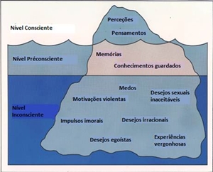 A seguir, na parte de baixo, estaria o pré-consciente, o qual faz a ligação entre o consciente e o inconsciente, e corresponde, na imagem do iceberg, a uma zona flutuante de passagem entre a parte visível e a oculta. É constituído por lembranças, isto é, aquilo de que nos podemos recordar sem fazer muito esforço. Por último, o inconsciente corresponde à parte maior do iceberg. É uma zona do psiquismo constituída por pulsões, tendências e desejos, fundamentalmente de carácter afetivo-sexual, a qual não é passível de conhecimento direto. A grande revolução introduzida por Freud, consistiu precisamente na afirmação da existência do inconsciente. O material inconsciente, tende a tornar-se consciente. Porém, há um conjunto de forças que se opõem a essa passagem. Freud compara o nosso psiquismo a uma grande sala - o inconsciente - a qual teria uma pequena antecâmara - o consciente. Na entrada da antecâmara há um vigilante que inspeciona as pulsões, os desejos, que querem passar- a barreira de censura. Se não lhe agradam, censura-os, impedindo a sua entrada, impossibilitando-os de se tornarem conscientes. Esse material inconsciente que foi impossibilitado de se tornar consciente pode ser sujeito a um processo de recalcamento. O recalcamento constitui um dos mecanismos de defesa que devolve ao inconsciente os materiais que procuram tornar-se conscientes, inerente ao equilíbrio do indivíduo. Em 1920, por motivos vários, entre os quais a dificuldade fazer coincidir o ego com o sistema pré-consciente/consciente e o inconsciente com o recalcado, já que uma parte do ego é inconsciente, Freud opta por uma nova descrição do sistema psíquico: id, ego e superego. Esta nova tópica permite captar o psiquismo com todo o seu dinamismo, porquanto menos rígida que a anterior, já que envolve interação entre as diferentes instâncias, não estando estáticas. O id é a zona inconsciente, primitiva, instintiva, a partir da qual se formam o ego e o superego. Existe desde o nascimento e é constituído por pulsões, instintos e desejos completamente desconhecidos, que posteriormente são recalcados. Na medida em que está desligado do real, não se orienta por normas ou princípios morais, sociais ou lógicos. «O id desconhece o julgamento de valores, o bem e o mal, a moralidade», no dizer de Freud. Assim, rege-se pelo principio do prazer. A fim de realizar e satisfazer os desejos e as pulsões de forma imediata impulsiona e pressiona o ego e a sua atividade é inconsciente. Grande parte destes desejos é de natureza sexual. O id é o reservatório da libido (Eros), energia das pulsões sexuais. "(...) é a parte obscura, impenetrável, da nossa personalidade, (...)", (Freud - 1932) Ego ou "eu" é a zona fundamentalmente consciente que se forma a partir do id. Rege-se pelo principio da realidade, orientando-se por princípios lógicos e decidindo quais os desejos e impulsos do id que podem ser realizados. É o mediador entre as pulsões inconscientes e as exigências do meio, do mundo real. Tem de gerir as pressões que recebe do id e as que recebe do superego. Forma-se durante o primeiro ano de vida. "A estrutura do ego (...). É composta de conhecimento e de defesa.(...)", (Tran-Tong - 1981) O super-eu ou superego é uma instância formada a partir de uma parte do ego, após o complexo de Édipo. É constituído pela interiorização de imagens idealizadas dos pais e das regras sociais. É a base da consciência moral, é «o defensor da luta em busca da perfeição – o superego é, resumindo, o máximo assimilado psicologicamente pelo individuo do que é considerado o lado superior da vida humana». É, portanto, a componente ética e moral do psiquismo. O superego age sobre o ego, pressionando-o, a fim de controlar o id, filtra os conflitos do id/ego, decide sobre o destino das pulsões, e a sua atividade é essencialmente inconsciente e pré-consciente. Mecanismos de Defesa do EgoO ego tem mecanismos de defesa, que são estratégias inconscientes que a pessoa usa para tentar reduzir a tensão e a ansiedade, fruto dos conflitos entre as instâncias: id, ego e superego. São, então, mecanismos de defesa: recalcamento; regressão; intelectualização; projeção; deslocamento; formação reativa e sublimação. Há entre os nossos impulsos, aqueles que são tolerados, como impulsos altruístas, manifestações estéticas, e aqueles que a moral social rejeita. Por exemplo, os impulsos egoístas, as exibições libidinosas, não são moralmente aceites na sociedade, pois estão em desacordo com as regras e costumes sociais. Deste desacordo, gerador de conflitos, resulta que se crie em nós uma função de censura, ou autocontrolo, que rejeita tendências indesejáveis, impedindo que se manifestem. À passagem dessas tendências ao inconsciente, por efeito ou função da censura, dá-se o nome de recalcamento. Os recalcamentos podem manifestar-se em efeitos, tais como complexos, reações de ansiedade, fenómenos de derivação, fenómenos de compensação, atos falhados (lapsos, esquecimento), fenómenos de simbolismo. O sujeito adota atitudes e comportamentos característicos de uma fase etária anterior. Face a uma frustração ou incapacidade para resolver determinados problemas, a criança ou o adulto regridem, procurando a proteção de épocas passadas, nas quais se sentiam seguros. Pela intelectualização, o sujeito justifica racionalmente o seu comportamento, ocultando aos outros e a si próprio as verdadeiras razões. É, portanto, um conjunto de estratégias de justificação de comportamentos, pensamentos, tendências psíquicas, lógicas e formuladas a posteriori, com o fim de evitar sentimentos de inferioridade que ponham em risco a auto estima. Assim, ele retira, inconscientemente, os aspetos emocionais de uma situação geradora de angústia e de stress. Tendência que os seres humanos tem para atribuir aos outros, comportamentos, sentimentos e des