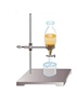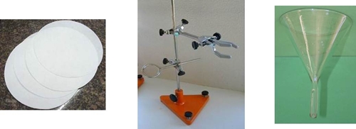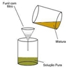 Procedimento experimental: 1º - Montou-se o suporte universal e encaixou-se a ampola de decantação na garra; 2º - Colocou-se o azeite e a água na ampola e a água caiu sucessivamente no gobelé vazio. O facto de o azeite ficar acima da água deve-se a este ser menos denso que a água. (imagem 1); 3º - A água escorreu no gobelé, misturou-se a areia e assim mexeu-se até se obter água turva. (imagem 2); 4º - Retirou-se a ampola do suporte universal e encaixou-se as argolas para funil adaptadas ao suporte. Depois colocou-se o funil de vidro nas argolas; (imagem 3); 5º - Dobrou-se o papel ficando com uma forma de um filtro. Esse papel reteve a terra deixando passar a água límpida; (imagem 4); 6º - A água límpida ficou depositada no gobelé e a areia no filtro de papel. Observação e registos: