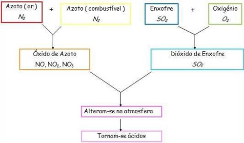 Causas da PoluiçãoEsta parte que vamos falar agora também está relacionada com as chuvas ácidas, pois é por causa da poluição que ocorrem as chuvas ácidas. A poluição atmosférica provoca alterações nas características físicas, químicas e biológicas do ar com consequências para os ecossistemas e para o ser humano. Esta causa está directamente ligada à chuva ácida, pois os gases que se acumulam na atmosfera vão alterar a composição química da chuva, que por sua vez se torna ácida. O azoto na forma gasosa com o azoto em combustível reagem originando óxido de azoto enquanto que o enxofre e o gás oxigénio reagem formando dióxido de enxofre, que por sua vez, os dois (óxido de azoto e dióxido de enxofre) reagem alterando-se na atmosfera e que faz se tornarem ácidos. É isso que traduz o diagrama seguinte:
