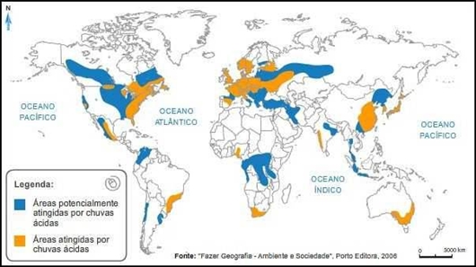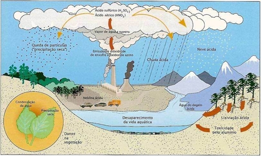 Fontes de PoluiçãoEm primeiro lugar, vem a queima de combustíveis fósseis que, todos os anos, envia quantidades colossais de poluentes para a atmosfera relacionada directamente com os transportes e as centrais eléctricas que deles são dependentes. Também a agricultura, as lixeiras (ao ar livre) e determinadas indústrias contribuem bastante para a poluição atmosférica causadora de chuvas ácidas. As fontes naturais representam apenas 10% na emissão de NOx e SO2 enviados para a atmosfera. Os vulcões e a decomposição de matéria orgânica são dos fenómenos naturais que mais contribuem para estas emissões. Consequências e EfeitosAs chuvas ácidas podem levar à morte de seres vivos, prejudicar a saúde humana, prejuízos materiais, destruição de florestas e campo agrícolas, à acidificação dos lagos, rios e de ecossistemas. Vamos falar de alguns aspectos e vamos começar pela saúde humana. Onde o organismo sofre: 1- Nariz e garganta: mais casos de asma e sinusite. 2- Olhos: maior probabilidade de conjuntivite. 3- Brônquios: maior predisposição à broncopneumonia. 4- Pulmões: riscos de enfisema. 5- Coração: mais doenças cardiovasculares. As chuvas ácidas têm também como consequência o aparecimento de algumas grutas, erosão de estátuas e monumentos. A acidificação da água dos lagos e dos rios pode levar à morte de plâncton, de peixes, de anfíbios e de moluscos e pode também levar à destruição das florestas e campos agrícolas nos ecossistemas terrestres. Soluções. Utilizar transportes colectivos: reduz a emissão de gases poluentes . Utilizar fontes de energia menos poluentes: energia hidroeléctrica, geotérmica, maremotriz, eólica e eventualmente nuclear. . Purificar os escapes dos veículos: utilizar gasolina sem chumbo e adaptar um conversor catalítico . Utilizar combustíveis com baixo teor de enxofre. . Utilizar purificadores nas indústrias para transformar grande parte das emissões de SO2 em substâncias menos poluentes Ciclo da chuva ácida