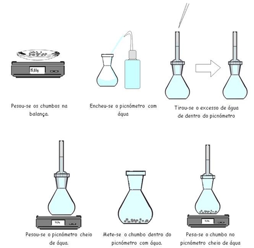 Objectivos: 1ª Parte do exercício: Descobrir a densidade e a densidade relativa do álcool e da água com a ajuda do picnómetro de sólidos. 2ª Parte do exercício: Determinar a densidade (massa volúmica) e densidade relativa de um sólido (chumbo) e de um líquido (água destilada) através do picnómetro de líquidos. Introdução Teórica: Cada substância é caracterizada por um conjunto de propriedades físicas e químicas como a densidade, a temperatura de fusão, a temperatura de ebulição, etc. Essas propriedades são também chamadas constantes físicas e permitem, no seu conjunto, identificar e reconhecer cada substância por entre outras, funcionando como o seu bilhete de identidade. Os materiais que se enquadram na Natureza não são, normalmente, substâncias puras mas sim misturas de substâncias, que podem ser separadas por diferentes processos. Mesmo as substâncias ditas puras têm uma determinada percentagem de impurezas, que determinam o grau de pureza da atmosfera. A determinação das constantes físicas de uma amostra de substância poderá, pois, servir para identificar essa substância e avaliar o seu grau de pureza. A densidade ou a massa volúmica de uma substância é a massa existente em cada unidade de volume dessa substância. Material: 1º Exercício: . Picnómetro de Líquidos. 2º Exercício: . Piconómetro de Sólidos; . Vidro do Relógio. Equipamento: . Balança. Reagentes: 1º Exercício: . Água destilada; . Álcool. 2º Exercício: . Água destilada; . Chumbo. Precauções: . Após a utilização da balança, deve-se desligá-la primeiro e só depois retirar o material pesado; . Pesar o picnómetro vazio bem seco; . Ao encher o picnómetro ter o cuidado de não deixar bolhas de ar; . Encher o picnómetro até a cima; . Limpar sempre o picnómetro por fora, tirando o excesso de água, antes de pesar. Procedimento: 1º Exercício: . Pesou-se na balança o picnómetro vazio; . Encheu-se com cuidado o picnómetro com álcool; . Pesou-se o picnómetro cheio de álcool; . Pesou-se novamente o picnómetro mas desta vez, cheio de água. . Verificou-se a temperatura ambiente; . Calculou-se a densidade do álcool; . Calculou-se a densidade relativa do álcool. 2º Exercício: . Pesou-se a massa do chumbo na balança sobre o vidro do relógio; . Encheu-se o picnómetro de água e tirou-se o excesso com um guardanapo; . Pesou-se a massa do picnómetro cheio de água na balança; . Meteu-se o chumbo dentro do picnómetro com a água e voltou-se a tirar o excesso com um papel absorvente; . Pesou-se a massa do picnómetro com a água e com o chumbo; . Verificou-se a temperatura ambiente; . Calculou-se a densidade do chumbo; . Calculou-se a densidade relativa do chumbo. Esquema: 1º Exercício: