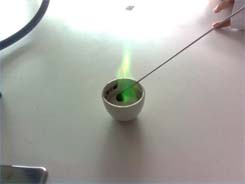 -Introduçao: É com ajuda do trabalho de laboratório que os químicos formulam hipóteses e as colocam à prova com experiências. O trabalho experimental é, de facto, uma componente importante e fundamental da Química. A realização de trabalhos experimentais nas aulas de Química facilita a compreensão do conhecimento científico, torna o ensino mais motivador e familiariza-nos com o método científico. Quando uma certa quantidade de energia é fornecida a um determinado elemento químico, alguns electrões da última camada de valência absorvem energia passando para um nível de energia mais elevado e produzem o chamado estado excitado. Quando um desses electrões excitados regressa ao estado fundamental, emite uma quantidade de energia radiante, igual àquela absorvida, cujo comprimento de onda é característico do elemento e da mudança do nível electrónico de energia. Assim, a luz de um comprimento de onda particular (ou cor) é utilizada para identificar o referido elemento. Tal procedimento é denominado teste da chama e é um método rápido e fácil de ser feito, e não requer nenhum equipamento que não seja encontrado normalmente num laboratório de química. Porém, a quantidade de elementos detectáveis é pequena e existe uma dificuldade em detectar concentrações baixas de alguns elementos, por exemplo, o sódio, que é um componente ou contaminante comum em muitos compostos, produz uma cor amarela intensa no teste de chama que tende a dominar sobre as outras cores. Por isso, a cor da chama geralmente é observada através de um vidro de cobalto azul para filtrar o amarelo produzido pelo sódio e permitir a visualização de cores produzidas por outros iões metálicos. O teste de chama apenas fornece informação qualitativa. Dados quantitativos, sobre a proporção dos elementos na amostra, podem ser obtidos por técnicas relacionadas a fotometria de chama ou espectroscopia de emissão. -Procedimento Experimental: -Material e Reagentes: