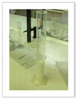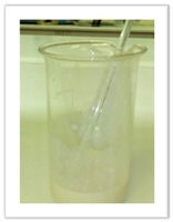 3. Deitámos, ambos os reagentes antes medidos, para um copo de precipitação de 250cm3; 4. Aquecemos a cerca de 200ºC durante 14 minutos, agitando sempre com a vareta de vidro até se formarem grumos; Atenção: não deixar a mistura ferver.