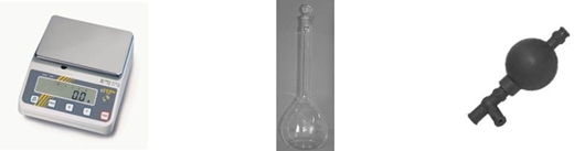 Figura 2 – Balança de Precisão Figura 3 – Balão Volumétrico Figura 4 – Pompete Procedimento A – Preparação de uma solução aquosa de tiossulfato de sódio de C=0,030 mol/dm-3 (figura 5) . Colocou-se o sal, com a ajuda de uma espátula, pouco a pouco, no Gobelé; . Tentou-se obter um valor próximo do pretendido (0,372 g); . Adicionou-se 20 mL de água desionizada ao Gobelé que continha o sal, e agitou-se até completa dissolução; . Transferiu-se a solução para o balão volumétrico com o auxílio de uma vareta e um funil; lavou-se a vareta, o Gobelé e o funil com pequenas porções de água desionizada e transferiu-se estas águas de lavagem para o balão volumétrico; . Adicionou-se água desionizada até ao traço de referência; e agitou-se até homogeneizar.