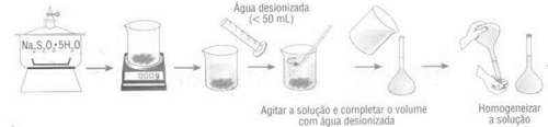Figura 5 – A - Preparação de uma solução aquosa de tiossulfato de sódio de C=0,030 mol/dm-3 B – Preparação de soluções diluídas a partir da solução anterior, com factor de diluição 5. (figura 6) . Mediu-se com uma pipeta graduada e coma ajuda de uma pompete 10 mL da solução anterior e transferiu-se para um balão volumétrico de 50 mL; . Adicionou-se água desionizada até ao traço de referência; agitou-se para homogeneizar.