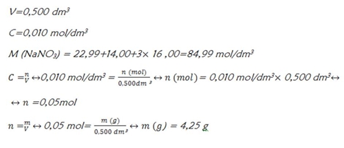 1. Pretende-se preparar 500 cm³ de uma solução aquosa de nitrato de sódio, NaNO3, com concentração 0,010 mol/dm-3 a partir do soluto sólido. Calcule a massa de soluto necessária para preparar esta solução.