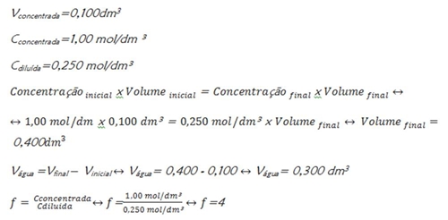 5. Que volume de água se deve adicionar a 100 mL de uma solução 1,00mol/L para que fique com uma concentração de 0,250 mol/L? Determine o factor de diluição.