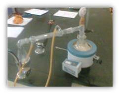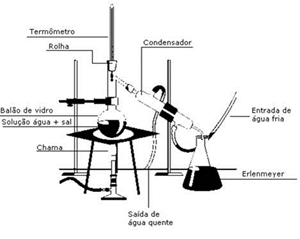 O material de destilação em posição se ser utilizado. (Foto tirada após p fim do processo de destilação) Conclusão - O processo de filtração foi bem sucedida, pois todos os extractos de terra presentes na solução ficaram retidos dentro do filtro, ficando assim dentro do kitasato apenas água com sal dissolvido. - Ficando assim como o primeiro passo para a concretização dos objectivos da actividade, pois tinha-se agora o primeiro elemento separado dos outros, a terra. - O processo de destilação também foi bem sucedido pois, mesmo tendo sido um sucesso a obtenção do sal no estado sólido, nem toda a água que se tinha inicialmente ficou contida dentro do balão de Erlenmeyer, devido a falhas no isolamento dos materiais. No entanto nenhuma das 3 substâncias ficou com vestígios de outra substancia. - Ficando assim concluída a actividade, tendo-se as 3 substâncias iniciais separadas. - Conclui-se então que os objectivos foram cumpridos, conseguindo-se separar as 3 substâncias, executar com êxito os processos de separação de misturas e aumentar a experiencia no trabalho de laboratório e em grupo. Criticas dos resultados - A água utilizada na actividade era água da torneira. - Apenas se encontravam á disposição 2 funis de Büchner para 4 grupos de trabalho. - Apenas se encontrava uma á disposição uma bomba de vácuo para 4 grupos de trabalho. - Na destilação existiam fendas entre o termómetro e o balão, que mesmo isoladas com fita cola permitiam alguma saída de vapor de água. - Quando o termómetro marcava os 112° o tubo de borracha que ligava a fonte de água ao condensador de tudo recto de Liebig soltou-se e a destilação teve se ser interrompida. Bibliografia - Química em contexto 10ºano, Porto Editora, SIMÕES Teresa, QUEIRÓS Maria, SIMÕES Maria, 1ºedição. - www.wikipedia.com - http://www.qmc.ufsc.br/qmc5230/aula02/destsimples.html