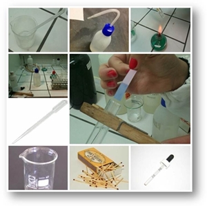 1.ª Experiência . Tubos de ensaio; . Suporte para os tubos de ensaio; . Pinça de madeira; . Vareta de vidro; . Vidro de relógio; . Pipeta de Pasteur; . Garrafa de esguicho; . Conta-gotas; . Lamparina . Fósforos . Gobelé de 150 ml.