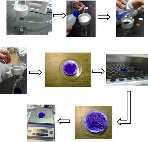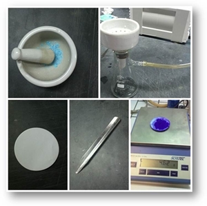 Síntese do sulfato de Tetraminocobre (II) Mono-Hidratado - Esta experiência teve duas etapas devido ao facto de a mistura, constituída pela solução de amoníaco e os cristais pulverizados de sulfato de cobre (II) penta-hidratado, ter de repousar até à aula seguinte. Na 1.ª etapa realizamos o seguinte:
