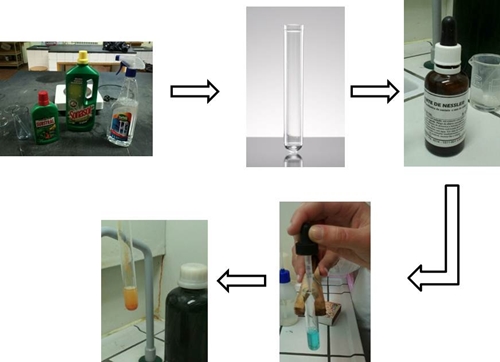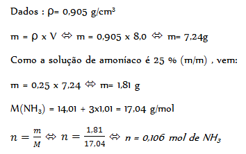 Experiência . Solução aquosa de hidróxido de sódio (NaOH); . Solução aquosa de amoníaco (NH3); . Solução aquosa de ácido clorídrico concentrado (HCl); . Solução aquosa diluída de sulfato de cobre II (CuSO4); . Reagente de Nessler; . Papel de litmus vermelho; . Sonasol; . Ajax dos vidros e chão; . Substral. 2.ª Experiência . Água destilada; . Álcool etílico a 96%; . Solução de amoníaco a 25% (m/m) . Sulfato de cobre (II) penta-hidratado.