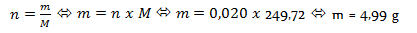 Os resultados calculados só dizem respeito à segunda experiência visto que na primeira não foi necessário o uso de cálculos. A síntese do sulfato de tetraminocobre (II) mono-hidratado é dada pela equação que se segue: CuSO4.5H2O (aq) + 4 NH3 (aq) → [Cu(NH3)4.H2O] (aq) + 4 H2O Cálculo da massa de CuSO4.5H2O para 0,020 mol M(CuSO4.5H2O) = 63,55 + 32,07 + 4 x 16,00 + 10 x 1,01 + 5 x 16,00 = 249,72 g/mol