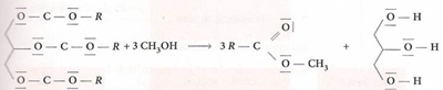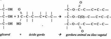 Fig.2 – Formação de gordura O biodiesel é um diéster, ou seja, é um glicérido com duas funções éster, proveniente de um ácido gordo, e como já foi referido, é um biocombustível líquido sintético renovável e biodegradável que se obtém a partir de lípidos naturais, como óleos vegetais ou gorduras animais, novos ou usados, mediante processo de transesterificação. A transesterificação consiste na cisão de um éster, quando reage com um álcool, em geral, o metanol, na presença de um catalisador. O catalisador pode ser ácido ou alcalino, mas, em geral, utiliza-se o hidróxido de sódio ou de potássio. Como produtos de reacção obtêm-se: éster metílico do ácido gordo - o biodiesel -, e o glicerol, que é um subproduto.