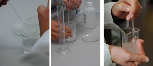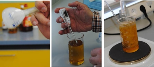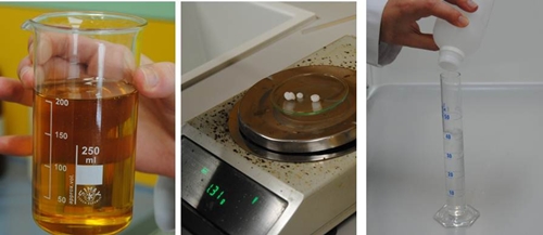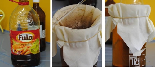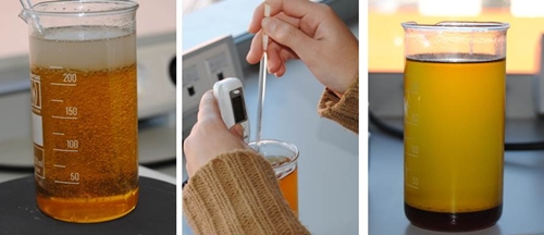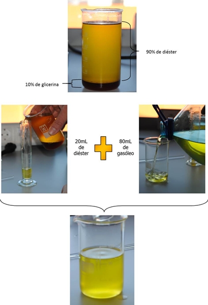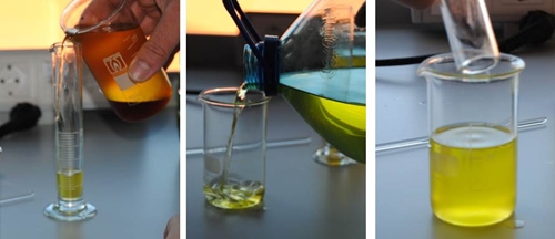 Procedimento Experimental 1) Filtrou-se o óleo usado, com um pano, para eliminar os resíduos sólidos[1];[2];[3]; 2) Colocaram-se 200mL desse óleo, num copo de precipitação[4]; 3) Pesaram-se 1,31g de hidróxido de sódio, num vidro de relógio[5]; 4) Mediram-se 50mL de metanol, com uma proveta[6]; NOTA: O metanol é uma substancia muito tóxica. Pode ser absorvido pela pele e se atingir os olhos pode provocar cegueira. Também há que ter cuidados muito especiais no manuseamento da solução alcalina pois é altamente corrosiva. 5) Passou-se o metanol para um copo de precipitação, ao qual se adicionou hidróxido de sódio[7]; NOTA: Este passo realizou-se na hotte, de modo a que os gases tóxicos libertados não fossem inalados. 6) Mexeu-se até o hidróxido de sódio se dissolver formação do metóxido de sódio (catalisador)[8];[9]; b Para facilitar e acelerar a dissolução, colocou-se a solução num balão volumétrico e agitou-se[10]. 7) Aqueceu-se o óleo usado, entre os 50ºC e 60ºC, com ajuda de uma placa de aquecimento[11]; 8) Juntou-se o metóxido obtido ao óleo e mexeu-se durante aproximadamente uma hora, tentando manter a solução sempre entre os 50/60⁰C[12];[13];[14]; 9) Deixou-se repousar a solução até ser possível observar 2 fases[15]: . Biodiesel; . Glicerina; 10) Mediram-se 20mL de biodiesel, numa proveta[16]; 11) Juntaram-se 80mL de gasóleo ao biodiesel medido, de modo a obter o BD20[17];[18]; 12) Lavou-se e arrumou-se todo o material utilizado. 4. Resultados Obtidos