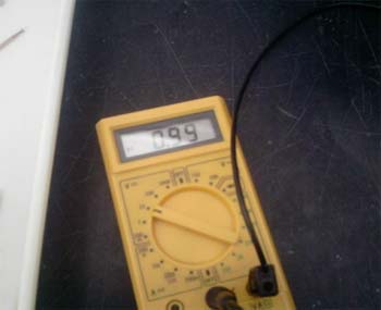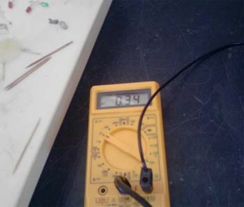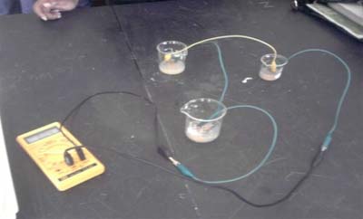 Após a não obtenção de valores de diferencia de potencial na montagem atrás descrita, ponderamos sobre as possíveis causas e fizemos variar algumas variáveis, utilizando sempre o mesmo material. Experiencia 1 a) Seguimos exactamente o mesmo procedimento, com excepção na colocação das placas de cobre e zinco. Estas, antes de serem colocadas na pilha de celulas, foram previamente mergulhadas no sumo de limão, com o intuito de aumentar a área de contacto entre os eléctrodos e o electrólito. Após esta ligeira modificação o voltímetro acusou, de forma instável, uma d.d.p. de aproximadamente 0,34 V