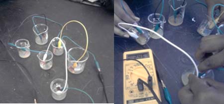 Experiencia 2 a) Material: . O mesmo utilizado na experiencia 1 . 6 Gobelés . 7 Crocodilos Procedimento O mesmo descrito na experiencia 2 b), mas com a utilização de 6 gobelés, 6 placas de cobre e de zinco e 7 crocodilos