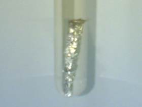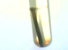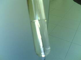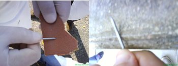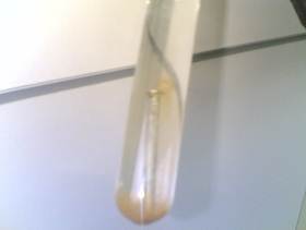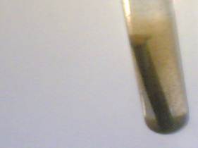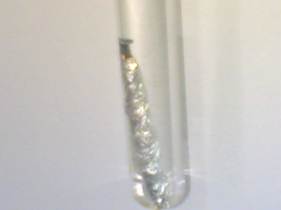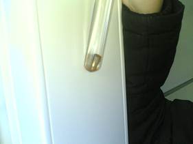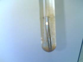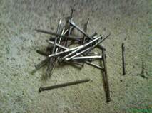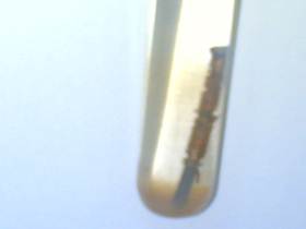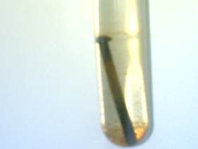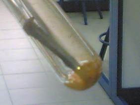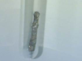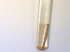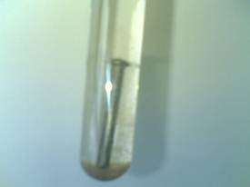 Fig.5- Prego dobrado 2. Preparou-se um conjunto de meios distintos: a) Água destilada; b) Água fervida (ausência de oxigénio dissolvido); c) Água do mar (ou solução de NaCl equivalente); d) Solução acida (por exemplo vinagre); e) Solução básica (por exemplo sonasol verde); f) Óleo alimentar ou parafina líquida (meio hidrófobo não oxigenado); g) Caixa contendo sílica (ou sacos de sílica utilizados no acontecimento de equipamentos sensíveis à humidade); h) Gel de agar-agar, preparado por dissolução de 1,5g de agar-agar em 100ml de água acabada de ferver, adicionando fenolftaleína e o hexacianoferreto(III) de potássio e esperar o tempo que arrefeça e solidifique. 3. Mergulharam-se as amostras de ferro anteriormente preparadas nos meios escolhidos e guardar 4. Construiu-se uma tabela de resultados esperados. 5. Observaram-se as peças semanalmente e registou-se a evolução das características superficiais. Resultados Obtidos
