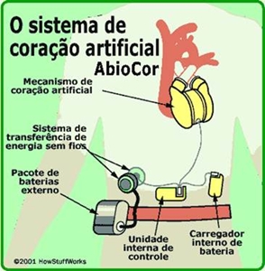 Fig. 6 As células de pele humana necessárias para o início do desenvolvimento foram obtidas a partir de biopsias feitas em pacientes. Os cientistas usaram a fibrina retirada das células saudáveis dos tecidos dos doadores. A seguir eles adicionaram ácido tranexâmico, para evitar a fibrinólise, ou seja, evita que a fibrina se destrua, e cloreto de cálcio para precipitar a coagulação da fibrina, e 0,1% de agarose. Este processo foi acompanhado por várias técnicas de microscopia, o que permitiu a verificação do desenvolvimento do tecido artificial a nível celular. Esta descoberta pioneira permitiu a utilização de pele artificial humana em pacientes, além das pesquisas terem sido realizadas em animais. Além disso, destacam os cientistas, a descoberta é útil no desenvolvimento de novas estratégias de tratamento de patologias dermatológicas. A pele criada em laboratório apresentou boas taxas de biocompatibilidade com o receptor e nenhum sinal de rejeição, degenerescência ou infecção. Outros substitutos artificiais da pele já foram criados com outros biomateriais, como colagénio, fibrina, ácido poliglicólico, quitosana e outros. Coração Artificial Um coração artificial é um dispositivo mecânico que substitui o coração, este tipo de corações são normalmente utilizados temporariamente até que seja efectuado um transplante definitivo de coração de um dador, e num número reduzido de casos, para substituir permanentemente o coração no caso não surja um dador compatível. O modelo mais utilizado foi criado pela Abiomed e é denominado AbioCor. O AbioCor é composto por uma liga de titânio e por um polímero denominado poliuretano. Este é conectado a quatro locais: à aurícula direita e esquerda, artéria aorta e pulmonar.