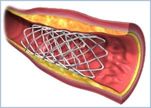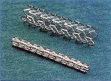 Fig. 7 Pacientes com este coração possuem ainda as artérias que batem simultaneamente, mas o Abiocor, que substitui ambos os ventrículos, só pode forçar o sangue a sair de um ventrículo de cada vez. Assim, ele enviará sangue, alternadamente, aos pulmões e, depois, ao corpo, em vez de fazer as duas coisas ao mesmo tempo, como o coração natural. O AbioCor consegue bombear mais de 10 litros por minuto, o que é suficiente para as atividades cotidianas. Stent Na medicina, um stent é uma endoprótese (prótese interna) expansível, que consiste num tubo metálico, geralmente de nitinol, aço e ligas de cromo e cobalto.