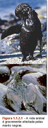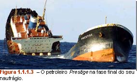 encontrava 50 quilómetros de Galiza, é lançado um pe Os danos do navio foram aumentando ao ponto de, no dia 19, se partir em dois e se afundar, levando com ele o restante combustível que ainda continha. O naufrágio deu-se apenas a 55 quilómetros da zona económica exclusiva portuguesa. Após de se ter afundado, o Prestige continuava a libertar fuelóleo devido às suas diversas fendas. A sua maior parte foi reparada por um submarino francês em Janeiro de 2003, altura em que as autoridades espanholas conseguiram extrair 37 mil toneladas de detritos, tanto em terra como no mar. Após seis meses o naufrágio, ainda eram libertadas duas toneladas de fuelóleo por dia. Por causa de acidente Portugal, Espanha e França proibiram a passagem nas suas águas de navios de casco simples, como era o caso do Prestige. Segundo especialistas, o incidente do Prestige poluiu mais do que o do Exxon Valdez. A contaminação estendeu-se a 200 quilómetros de costa e, de acordo com estimativas, mais de 200 mil aves sofreram os efeitos desta maré negra, para além de muitos peixes. A maior catástrofe ambiental da história da Espanha provocou uma grave crise económica e social, uma vez que causou vários distúrbios na cadeia alimentar marítima, afectando, assim, as pescas (área de maior rendimento da Galiza) e que, nas praias atingidas, a prática balnear foi proibida, perturbando o turismo. 1.1.2. Consequências Existem vários efeitos das marés negras sobre ambiente, que variam com o tipo de acidente e o local de acidente.
