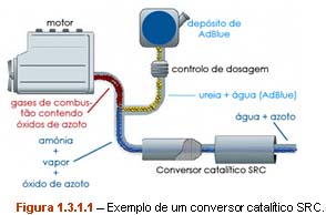 primeiro tipo e em diferentes fases no Os conversores catalíticos são usados para filtrar os gases libertados pelos escapes dos automóveis e a nível industrial, designadamente, na redução de NOx, na oxidação de combustíveis e na oxidação e redução simultânea de gases de combustão. Nos automóveis são usados catalisadores de redução selectivos, onde é usado platina ou ródio, de modo a diminuir as emissões dos óxidos de azoto. Isto deve-se às seguintes reacções químicas: 2 NO → N2 + O2 2 NO2 → N2 + 2 O2 Industrialmente, os gases poluentes atravessam discos porosos ou de materiais porosos contendo os metais catalisadores, de modo a aumentar a eficiência do conversor catalítico. Com o mesmo intento, é acrescentada uma pequena quantidade de amónia ou ureia, provocando as seguintes reacções: 4 NO + 4 NH3 + O2 → 4 N2 + 6 H2O 6 NO2 + 8 NH3 → 7 N2 + 12 H2O