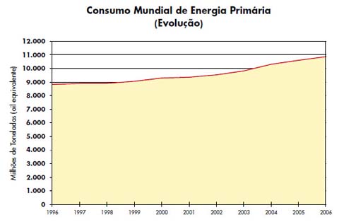 Apesar de ter crescido relativamente pouco entre 1996 e 2006, o valor do consumo mundial de energia primária é muito elevado, como se vê no seguinte gráfico.