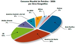 Porém, não está previsto uma diminuição da velocidade de aumento, pois devido ao crescimento demográfico e desenvolvimento económicos haverá cada vez mais países consumidores de grandes quantidades de energia. O gráfico seguinte retrata a distribuição de consumo de petróleo por área geográfica, com dados de 2006, e constata-se, claramente, um domínio da parte dos países desenvolvidos.