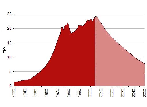 No seguinte gráfico está representada a curva de Hubbert aplicada à produção mundial de petróleo, onde mostra a evolução da produção até 2004 e a previsão da ASPO sobre o que pode ocorrer após esse ponto.