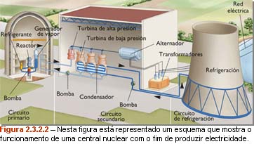 As fissões nucleares, que ocorrem no reactor, libertam energia suficiente para aquecer água que se encontra no circuito primário, selada a altas pressões de modo a que não se evapore. O calor contido nesta água é transferido através de condução para a água do circuito secundário, que passa ao estado gasoso. O vapor de água produzido causa o movimento das pás de uma turbina ligada a um gerador de corrente eléctrica. Após isto, o vapor entra num condensador, que está a ser constantemente refrigerado por água fria, e muda para o estado líquido, sendo de novo bombeada para o circuito secundário. As reacções de fusão nuclear, por sua vez, são baseadas na conversão de hidrogénio em hélio, tendo como reagentes o deutério e o tritio. A equação química seguinte expressa essa conversão: 31H + 21H → 42He + 10n