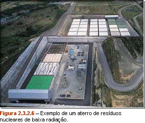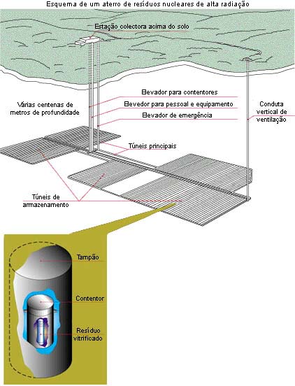 nucleares: de baixa radiação e de alta radiação. O seu confinamento depe Os resíduos de baixa radiação podem ser armazenados perto da superfície em contentores bem vedados, constituídos de materiais imunes à corrosão. O outro tipo de resíduos, isto é, os resíduos de alta radiação, carece de maiores investimentos no seu armazenamento. Os aterros deste tipo de resíduos são construídos a várias centenas de metros de profundidade e em locais distantes de aquíferos e constituídos por camadas geológicas específicas, que sejam o mais possível estanques. Este tipo de aterro é esclarecido na seguinte figura: