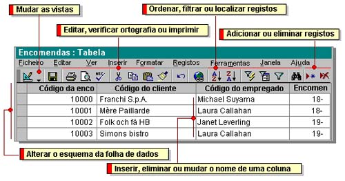 Fig.2 O esquema mostra os comandos da Barra de menus, os Botões da Barra de ferramentas e o exemplo de uma tabela preenchida com alguns dados. Fonte: http://civil.fe.up.pt/acruz/access/(05/05/2009) Na presente vista, a vista da Folha de dados da tabela, pode-se adicionar, editar ou ver dados contidos numa tabela. Também se pode verificar a ortografia e imprimir os dados da tabela, filtrar ou ordenar os registos, alterar o aspecto da folha de dados ou alterar a estrutura da tabela adicionando ou eliminando colunas.
