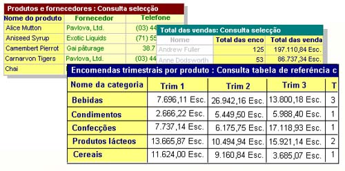 Fig.5 Três exemplos de consultas. Fonte: http://civil.fe.up.pt/acruz/access/(05/05/2009) Criar uma consulta O Microsoft Access pode criar consultas, para que não tenha que estruturar uma de raiz: . Para criar uma consulta para utilizar como base de um formulário ou relatório, pode utilizar os assistentes de formulário ou relatório. Estes assistentes criam o formulário ou relatório e, se estiver baseado em mais do que uma tabela, também criam a instrução SQL subjacente. Se quiser, pode guardar a instrução SQL como uma consulta. . Para criar facilmente consultas que pretenda executar independentemente ou nas quais pretenda basear múltiplos formulários ou relatórios, pode utilizar um dos assistentes de consultas. Os assistentes de consultas executam todo o trabalho básico depois de fornecer respostas para uma série de perguntas. Mesmo que tenha criado muitas consultas, pode querer utilizar um assistente para estruturar rapidamente a consulta. Depois, pode mudar para a vista de estrutura para personalizar. . Para criar consultas a partir dos filtros criados através de Filtrar por formulário, Filtrar por selecção ou Filtrar para entrada, guarde o filtro como uma consulta. Modelo relacional O modelo relacional é um modelo de dados, adequado a ser o modelo subjacente de um SGBD, que se baseia no princípio em que todos os dados estão guardados em tabelas. Toda a sua definição teórica e baseada na lógica de qualidade e na teoria dos conjuntos. O conceito foi criado por Edgar Codd em 1970, sendo descrito no artigo "Relational Model of Data for Large Shared Data Banks". Na verdade o modelo relacional foi o primeiro modelo de dados descritos teoricamente, as bases de dados já existentes passaram então a ser conhecidas como (modelo hierárquico, modelo em rede ou Codasyl e modelo de listas invertidas).