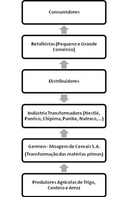 Mas a Germen também vende directamente ao consumidor final, em quantidades menos expressivas, como é óbvio. A logística, que envolve toda a cadeia, tem como objectivo, fornecer o máximo valor aos consumidores-alvo e a Germen - Moagem de Cereais S.A. opta, como podemos observar, por negociar fundamentalmente com os produtores agrícolas de países da Europa e do Continente Americano[3] adquirindo trigo, centeio e arroz, transformando-os depois em farinhas de diversos tipos e dos três cereais em causa, para depois fornecer os seus produtos a grandes empresas como a Nestlé, Panrico, Panike, entre outras[2]. Veja-se a gama de produtos transformados por esta indústria de base: Farinha de Trigo T55 Força (para pastelaria), Farinha de Trigo T55 (para pastelaria), Farinha de Trigo T65 Aveirense (para panificação), Farinha de Trigo T65 Corrigida (para panificação), Farinha de, Trigo T65 Corrigida Especial (para panificação), Farinha de Trigo T65 Composta (para panificação), Farinha de Trigo T55 (para bolachas), Farinha de Trigo T80 (Para panificação), Farinha de Trigo T150 (para panificação), Farinha de Centeio T70 (para panificação), Farinha de Centeio T85 (para panificação), Farinha de Centeio T130 (para panificação), Farinha de Centeio T170 (para panificação), Farinha de Arroz (para panificação), Farinha de Trigo de 5Kg (para usos culinários), Farinha de Trigo T55 sem fermento de 1Kg, Farinha de Trigo T55 com fermento de 1Kg, Sêmea de Trigo Grossa e Sêmea de Trigo Fina[4]. A empresa facilita ainda, o processo de fabrico dos Industriais de Panificação, através de um produto especial denominado Unipan, comercializando até quatro formatos diferentes deste produto: Biju, Pão de Forma, Pão de Centeio e Pão de Milho Amarelo[4]. É importante, ainda, referir que as Farinhas de Trigo para panificação dominam metade do volume de vendas desta empresa[2] e, a empresa pode criar produtos específicos a pedido dos clientes[5]. Além da variedade de produtos e da disponibilização de produtos específicos moldável aos interesses dos clientes, a satisfação das empresas-clientes é adquirida através da sua rastreabilidade e da devida certificação dos sistemas de segurança alimentar e de gestão de qualidade[2]. Toda a cadeia de comercialização falha, se cada um dos "patamares" da cadeia falhar, principalmente ao nível da segurança e qualidade dos produtores onde a indústria-base como a Germen toma um papel de grande importância. Portanto, torna-se um ponto-chave atender especialmente, aos processos de desenvolvimento, produção, processamento, armazenamento e transporte e é, por consequência, imperativo, que haja uma cooperação coordenada entre todos os “actores” da cadeia. Até ao consumidor final, os restantes sectores devem assegurar a qualidade dos seus serviços, nomeadamente: Os produtores, asseguram uma produção de qualidade e abastada das matérias-primas a usar pela indústria de base (Germen) e que sustentará toda a cadeia agro-alimentar. É importante referir que existem desvantagens potenciais associadas, como potenciais problemas climáticos ou de contaminações poderem influenciar a produção e o abastecimento da cadeia. As empresas da indústria transformadora, para onde são enviadas as matérias-primas transformadas pela Germen são, essencialmente aquelas ligadas às marcas que atraem os consumidores ou pelo menos as mais sonantes. Neste caso, a Nestlé, Panrico, Panike, Nutraco e Chipima[2]. Além de terem um papel fulcral no armazenamento, processamento e desenvolvimento dos seus produtos, têm que apostar fortemente no marketing optimizando os volumes de venda, que beneficiam toda a cadeia. Os distribuidores, devem assegurar a respectiva distribuição e armazenamento dos produtos fabricados segundo normas de qualidade de forma eficaz, fazendo a “ponte” entre a indústria transformadora e os retalhistas. Uma das desvantagens presentes e, verificada inclusive recentemente no seio da sociedade portuguesa, foi que o descontentamento do sector levando à greve dos seus trabalhadores, afecta toda a cadeia transversalmente. O caso em estudo não fugiu à regra. Os retalhistas, que são o grande (Jumbo, Continente, Intermarché, etc) e o pequeno comércio essencialmente, devem assegurar um armazenamento em condições de segurança, de higiene e de qualidade, segundo normas estabelecidas. Devem ainda, assegurar a divulgação dos produtos desenvolvidos pela cadeia e, a respectiva venda, demonstrando transparência e estabelecendo relações de confiança com o consumidor. Estes são o “rosto” de toda a cadeia. Se falharem, os produtores, transformadores e distribuidores arriscam-se a verem todo o investimento na produção de produtos em risco. Os retalhistas são ainda importantes, na medida que podem fornecer valiosas informações aos restantes sectores da cadeia sobre as necessidades dos consumidores. Portanto, como se pode observar, cada membro da cadeia tem um papel e é especializado em uma ou mais funções, com vista ao alcance do bem comum, que é maximizar os lucros da cadeia ao mesmo tempo que se procura satisfazer o consumidor [6]. Uma boa coordenação nesta cadeia, regida por profissionalismo, transparência e comunicação permite [1]: Maior qualidade de produtos; Riscos de segurança reduzidos; Aumento da eficácia dos recursos materiais e de informação; Maior eficácia de produção; Redução de custos de transacção; Maiores Lucros; Maior abrangência geográfica de mercado e maior expansão da rede de distribuição a baixos custos. Todavia, existem desvantagens potenciais, como as que já vimos anteriormente e também fundamentalmente, se falha a transparência, a comunicação entre as empresas da cadeia de comercialização e também conflitos recorrentes, que poderão ocorrer entre os parceiros. Estas falhas são especialmente comuns quanto maior forem os níveis da cadeia[6]. O sucesso de 